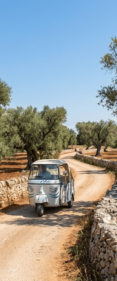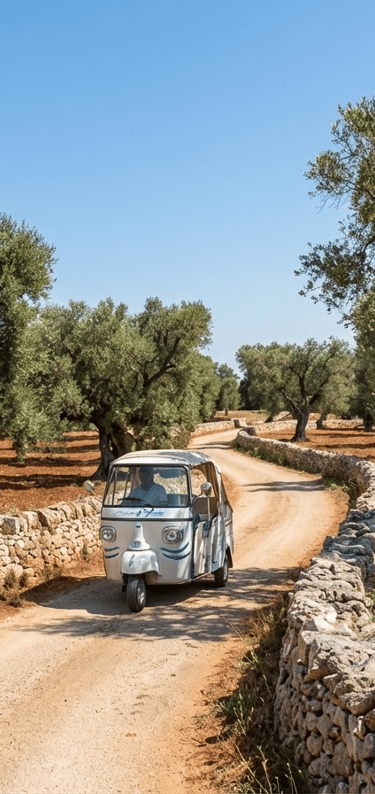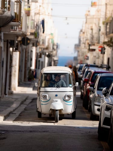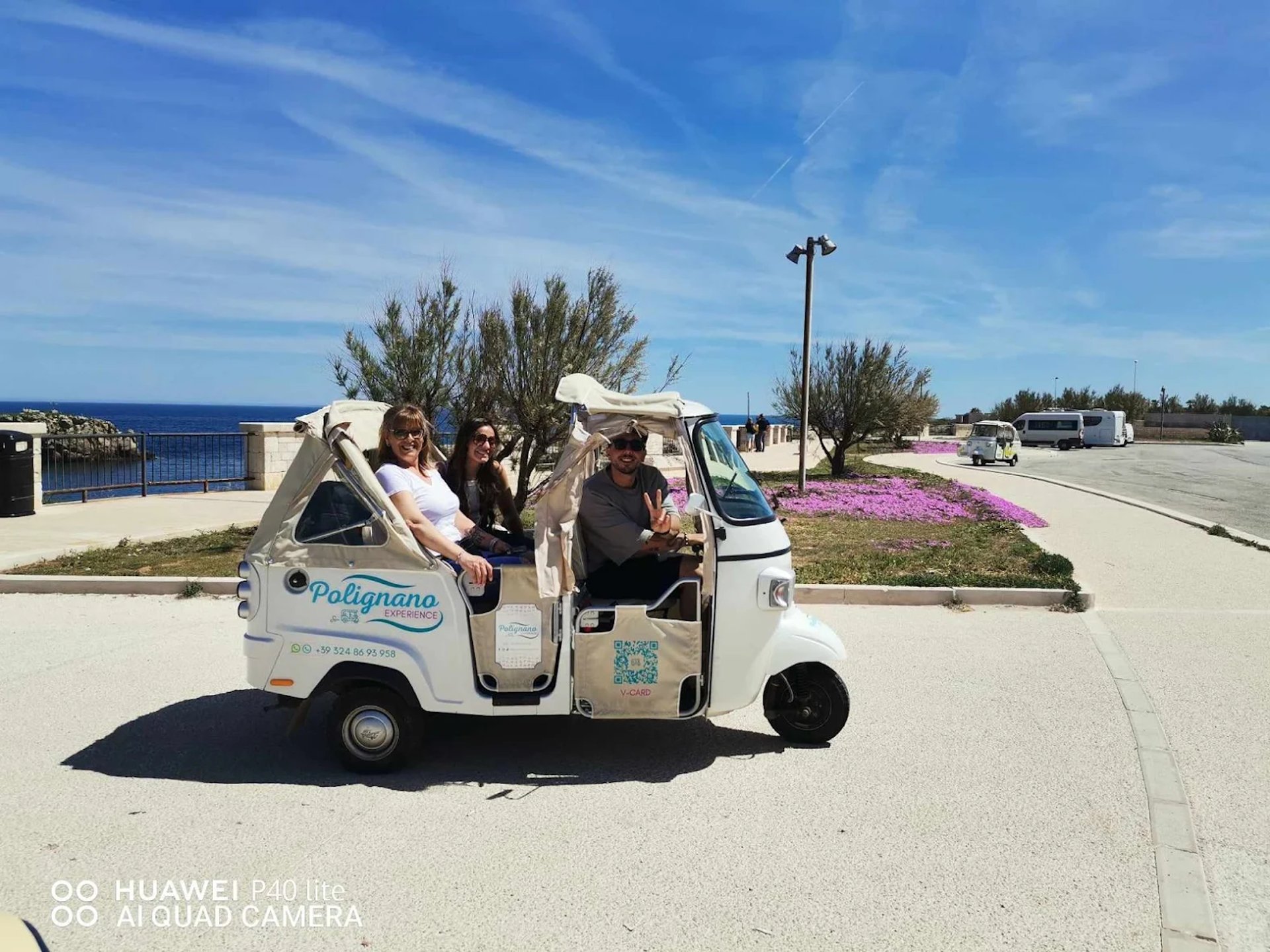 Explore Polignano a Mare by private Ape Calessino (tuk tuk). A comfortable, scenic and customizable tour with a local guide, perfect for couples, families and small groups.